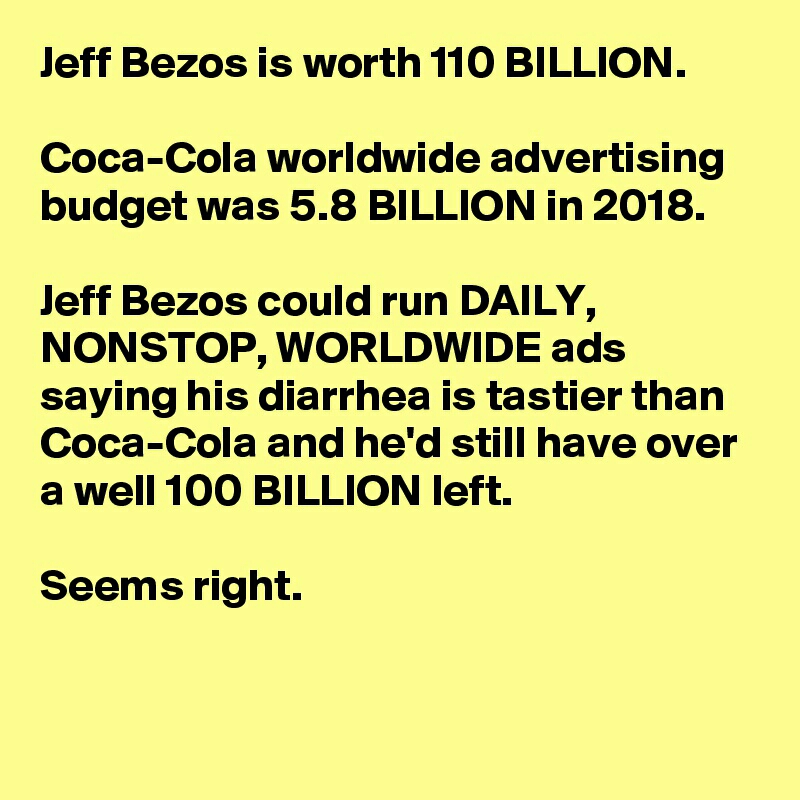 Jeff Bezos could run daily, non stop, worldwide ads saying his diarrhea is tastier than CocaCola – Billion Mindset 🤔 0 26th Jan 202026th Jan 2020 Written by Vernon The wealthier you are, the more you be able to gain more market. Share this: Share on X (Opens in new window) X Share on Facebook (Opens in new window) Facebook Like Loading... Related